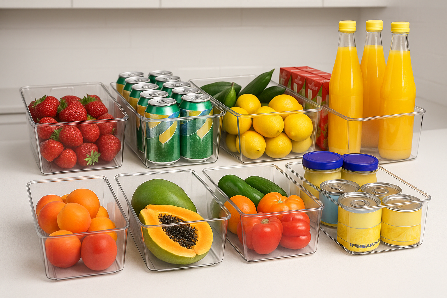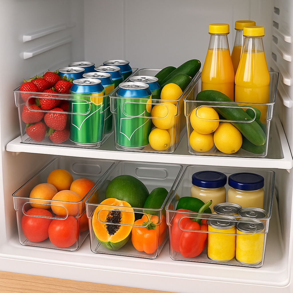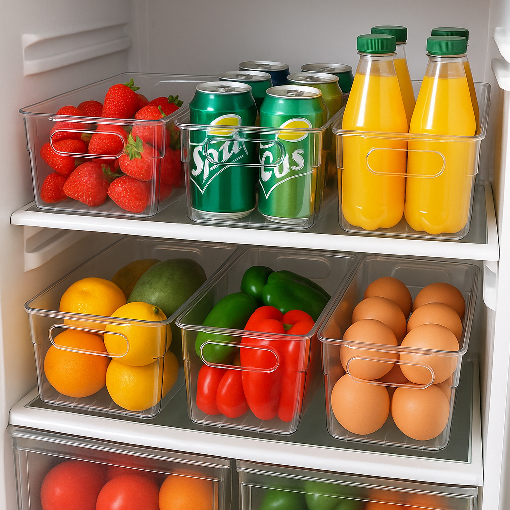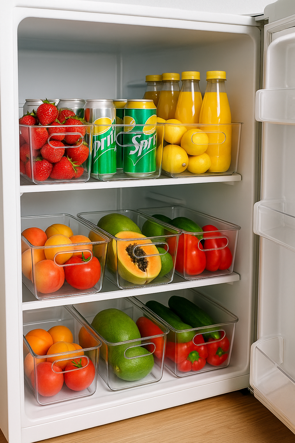 Este set de 8 organizadores transparentes te permite clasificar frutas, verduras, bebidas, snacks y alimentos con total comodidad, aprovechando mejor el espacio de tu refrigerador, alacena o despensa.